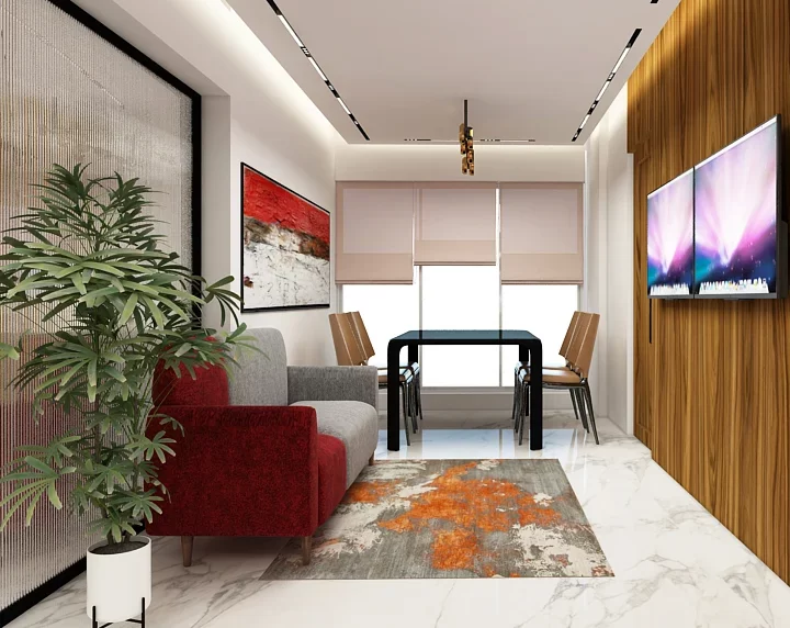 The process to drape the elevations was simpler when the plan was established. The Ebony Veneer Panels to compliment the White Marble with a contrast of black veneer doors, stood tall with even the height restrictions. Keeping the palette light and furbishing the space with classy leather seating added to the grandeur. Modern pendant lights with a blend of magnetic track lights added to the classy-modern decor. This was a project projecting, #HappyClientHappyUs!