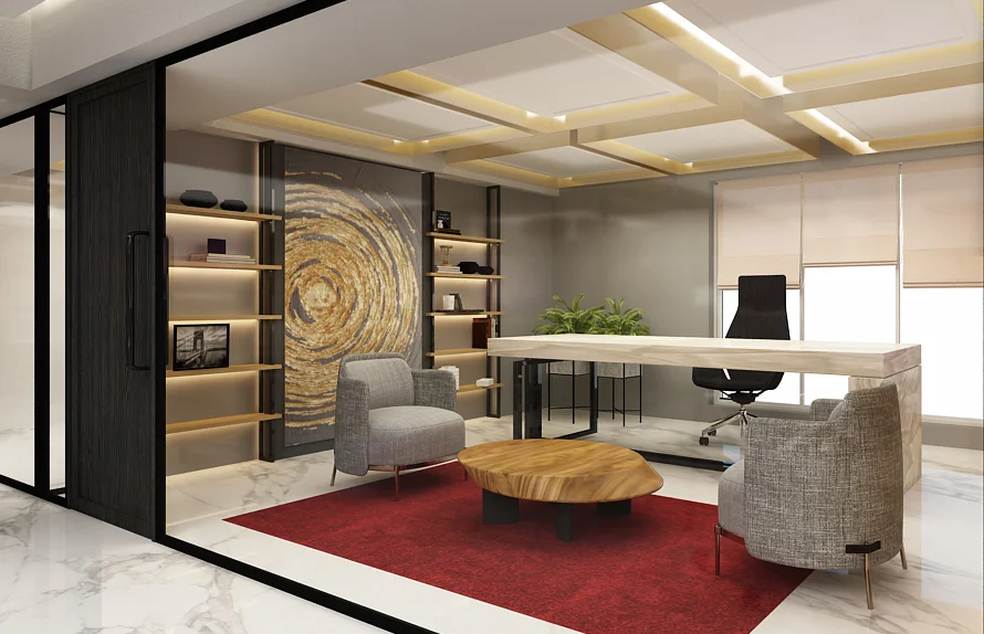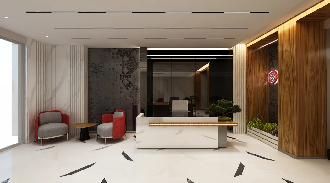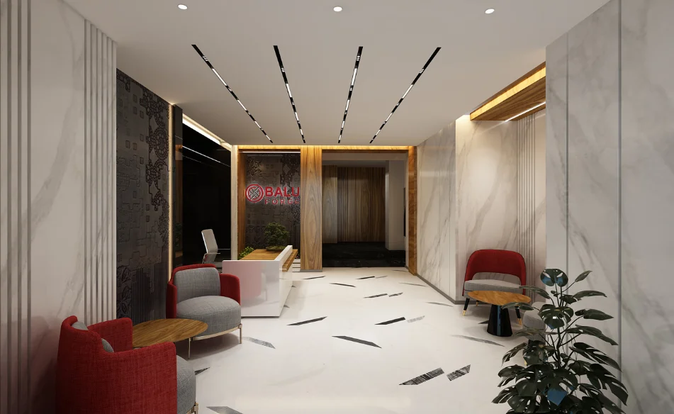 Balu, an avant-garde manufacturer of Forged crankshafts and Forged Components, and the owner of Imperial Palace (one) converted their top floor to an Executive Office to cater to their National and International Clientele. The design was to display a grandeur through marble and veneer, glass and metal, and display a modern adobe for its key members and staff. We were blessed to be appointed as their design partners, to give them their corporate set-up along with the responsibility of the façade face-lift and a design for their Hotel Reception, to blend smoothly to their top floor welcome area.
