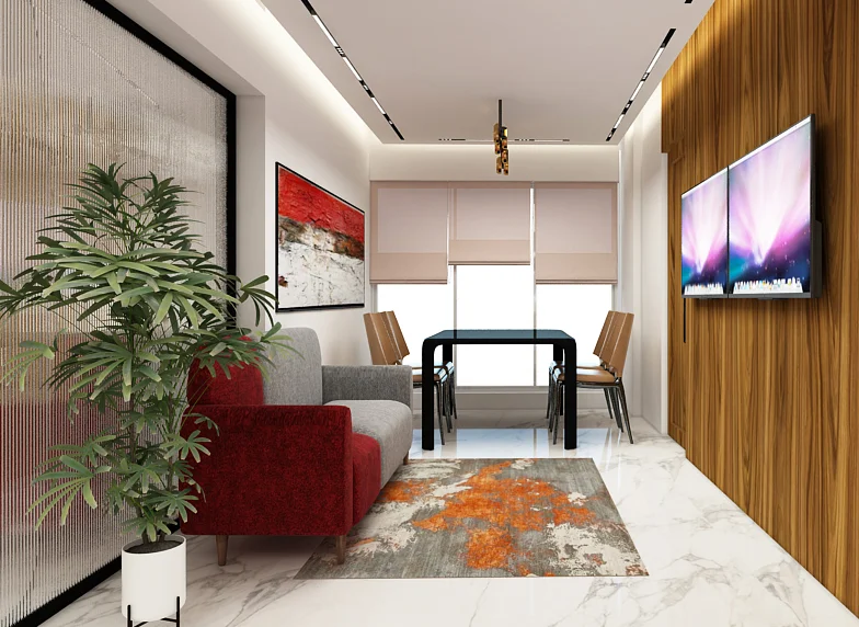 The process to drape the elevations was simpler when the plan was established. The Ebony Veneer Panels to compliment the White Marble with a contrast of black veneer doors, stood tall with even the height restrictions. Keeping the palette light and furbishing the space with classy leather seating added to the grandeur. Modern pendant lights with a blend of magnetic track lights added to the classy-modern decor. This was a project projecting, #HappyClientHappyUs!