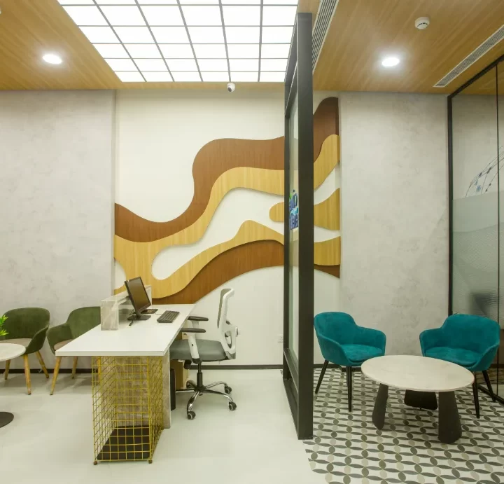 The ambience was casual with a foretaste of an industrial look but enhanced with the warmth of wood and greens. The Welcome area showcased a layered wooden mural inspired by the wave from the logo. We kept the backdrop transparent yet diffused with a fluted glass to keep the expanse unbroken. The lounges at the welcome area and behind the backdrop, were linked through a continuous ceiling to make it look grander. An angle to the glass partitions was intentional to give some dynamics to the space. The glass film was also inspired from the wave of the logo.