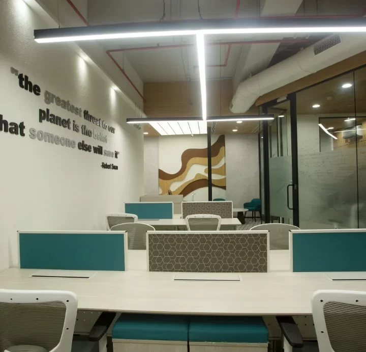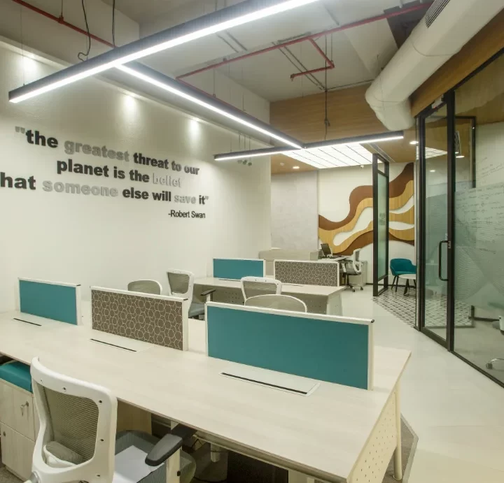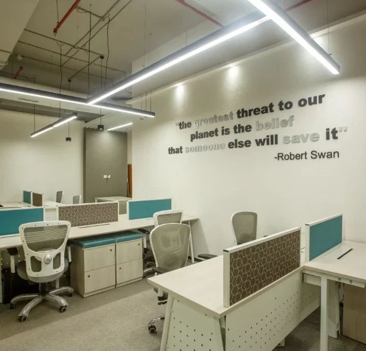 The grey hues were applied with variations of materials from tiles to carpets and Concrete wallpapers to the Corian counters. The blue of the logo was executed on the soft boards and graphics with a contrast in the furniture. The open workspace exhibited a quote by Robert Swan that justified the business – “The Greatest Threat To Our Planet is the Belief that Someone Else Will Save It”, which is motivational and engaging in itself. We implemented the branding through a few more words in the form of scrabble displaying the values and missions of the company.