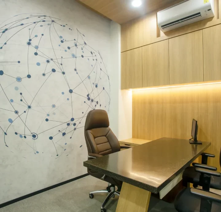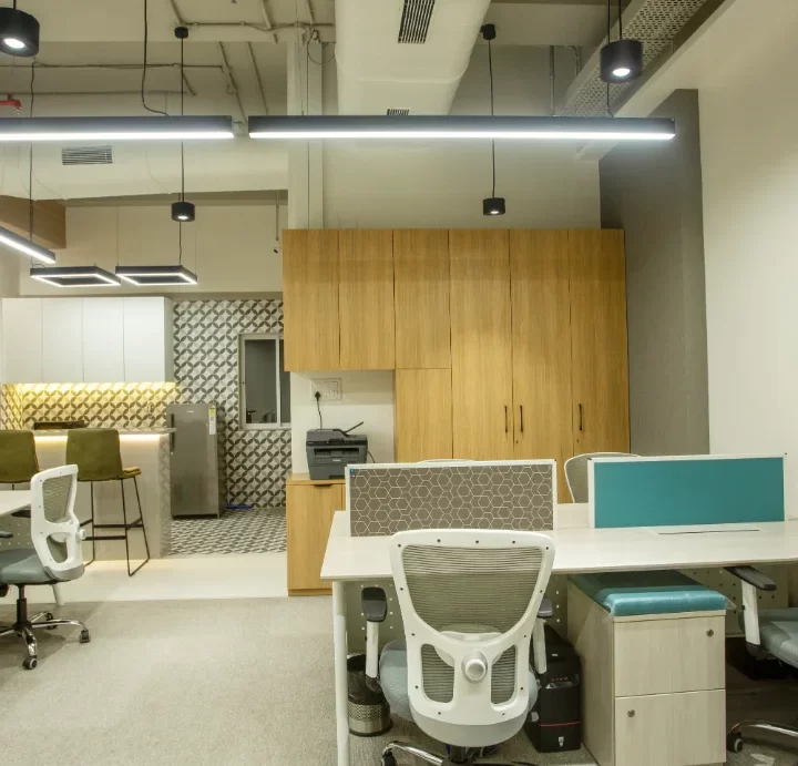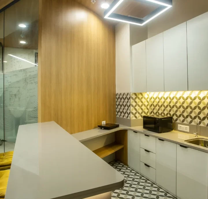 As we said – No Windows. No Problem! We stimulated the workplace with the use of day light fixtures, tall glass partitions with black strong edged frames and a warmth of the greens and wood. The absence of natural light can cause fatigue and low moods. The challenge to keep the spirit of the employees at its peak was essential by building up a sense of belongingness to the space through elements that make them comfortable and focused. We catered to it by opening up the small welcome area with a huge skylight mock in a seamless wooden ceiling. The light spanned through the workspace and the enclosures making the entrant cheer-up even after entering the windowless space. The distribution of task lights in a broken geometric grid also added some spice to the open ceiling office workspace.