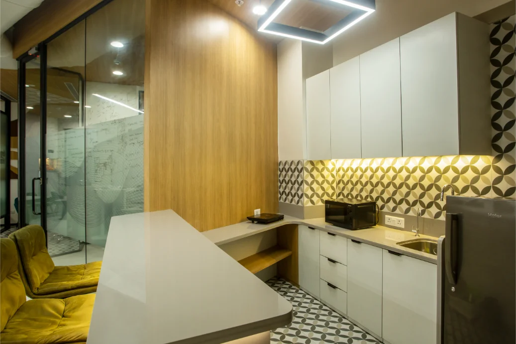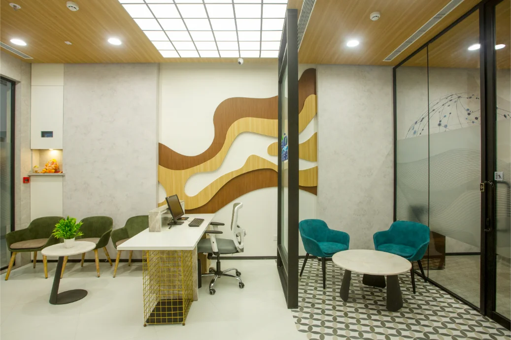 The ambience was casual with a foretaste of an industrial look but enhanced with the warmth of wood and greens. The Welcome area showcased a layered wooden mural inspired by the wave from the logo. We kept the backdrop transparent yet diffused with a fluted glass to keep the expanse unbroken. The lounges at the welcome area and behind the backdrop, were linked through a continuous ceiling to make it look grander. An angle to the glass partitions was intentional to give some dynamics to the space. The glass film was also inspired from the wave of the logo.