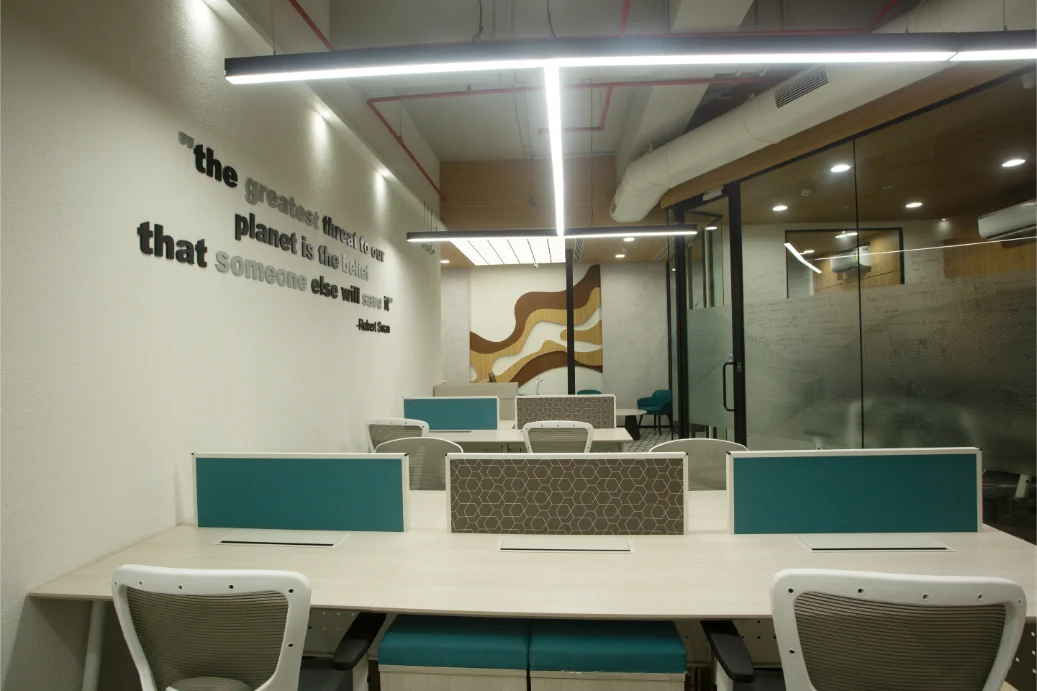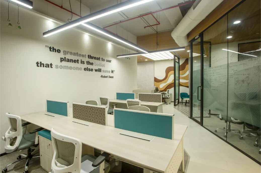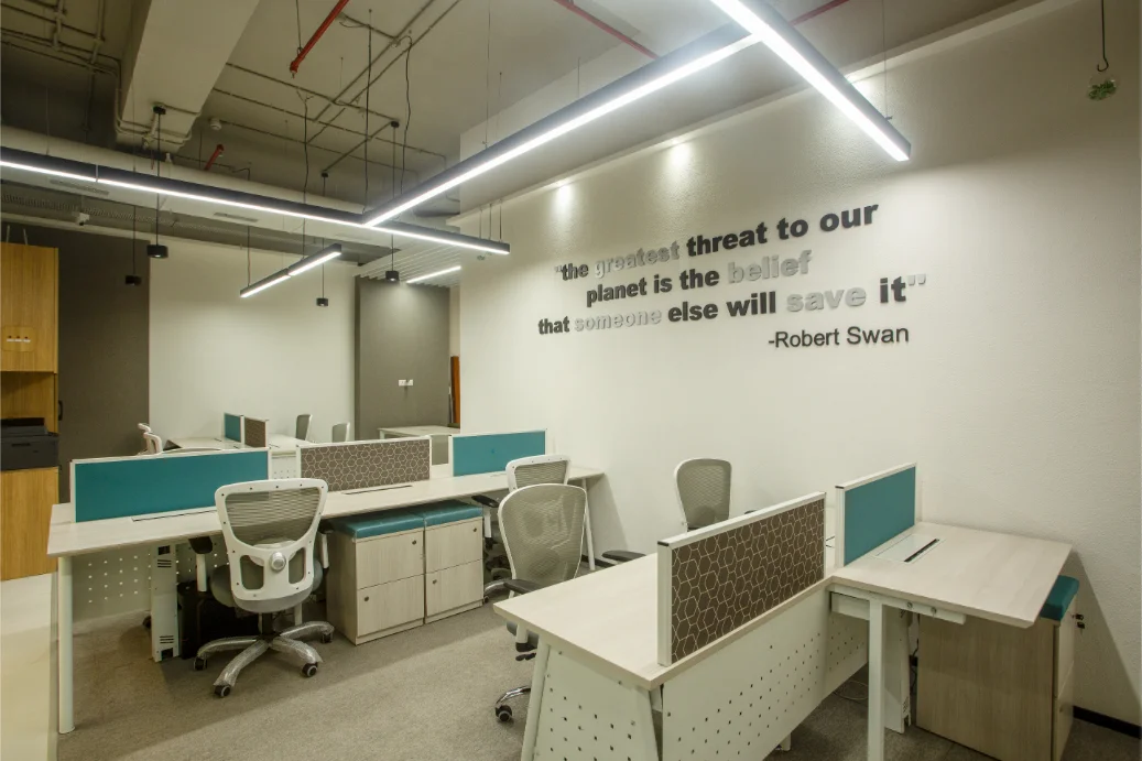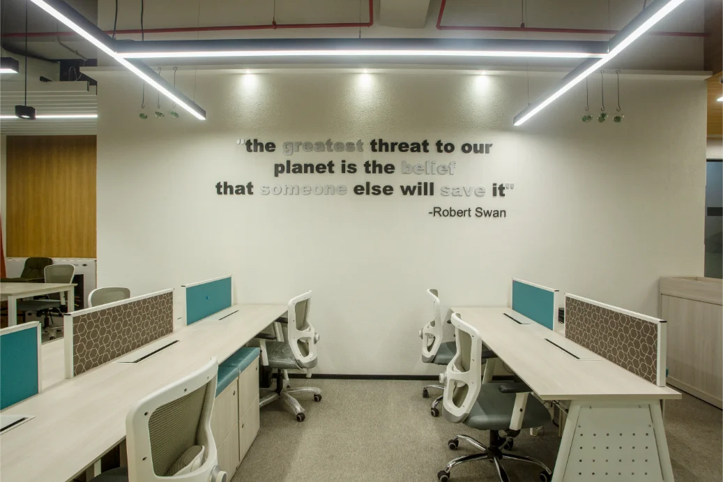 The grey hues were applied with variations of materials from tiles to carpets and Concrete wallpapers to the Corian counters. The blue of the logo was executed on the soft boards and graphics with a contrast in the furniture. The open workspace exhibited a quote by Robert Swan that justified the business – “The Greatest Threat To Our Planet is the Belief that Someone Else Will Save It”, which is motivational and engaging in itself. We implemented the branding through a few more words in the form of scrabble displaying the values and missions of the company.