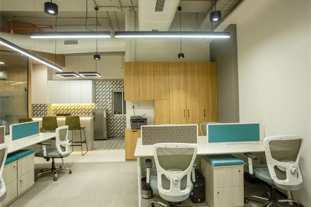 As we said – No Windows. No Problem! We stimulated the workplace with the use of day light fixtures, tall glass partitions with black strong edged frames and a warmth of the greens and wood. The absence of natural light can cause fatigue and low moods. The challenge to keep the spirit of the employees at its peak was essential by building up a sense of belongingness to the space through elements that make them comfortable and focused. We catered to it by opening up the small welcome area with a huge skylight mock in a seamless wooden ceiling. The light spanned through the workspace and the enclosures making the entrant cheer-up even after entering the windowless space. The distribution of task lights in a broken geometric grid also added some spice to the open ceiling office workspace.
