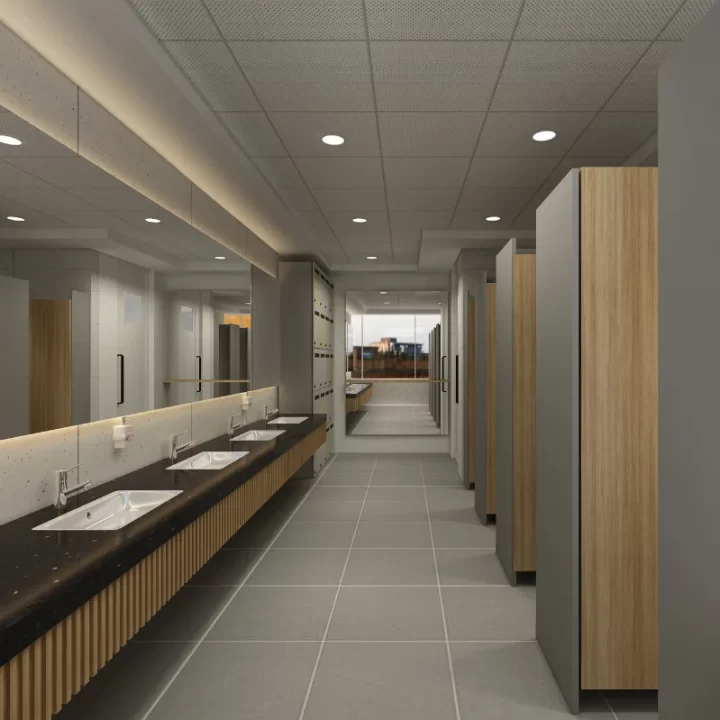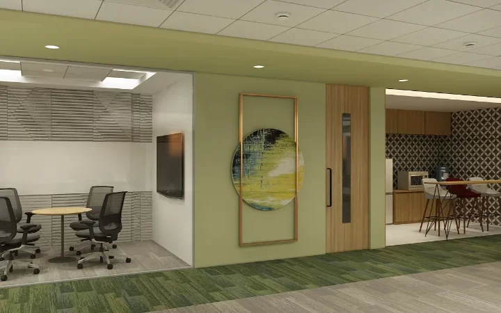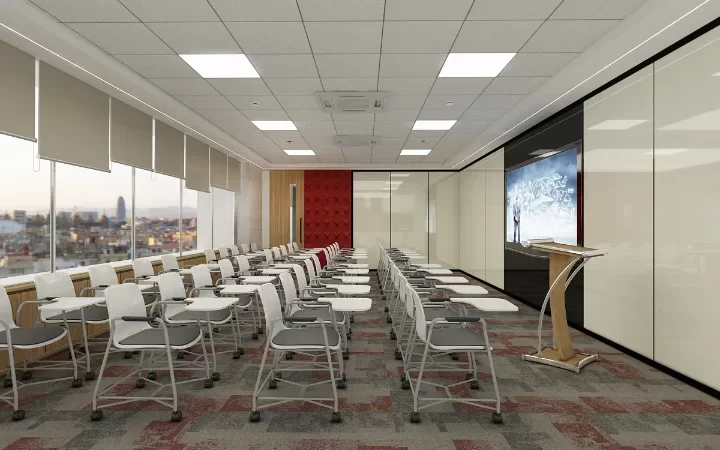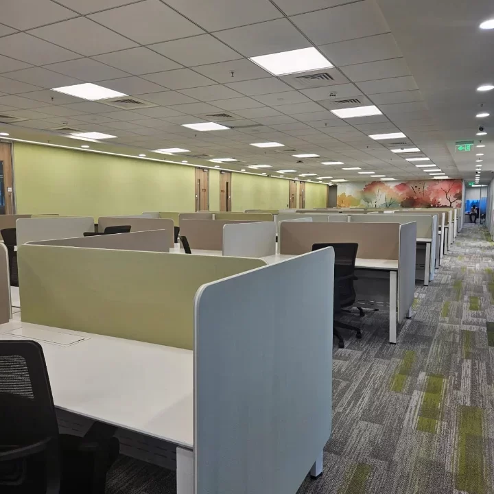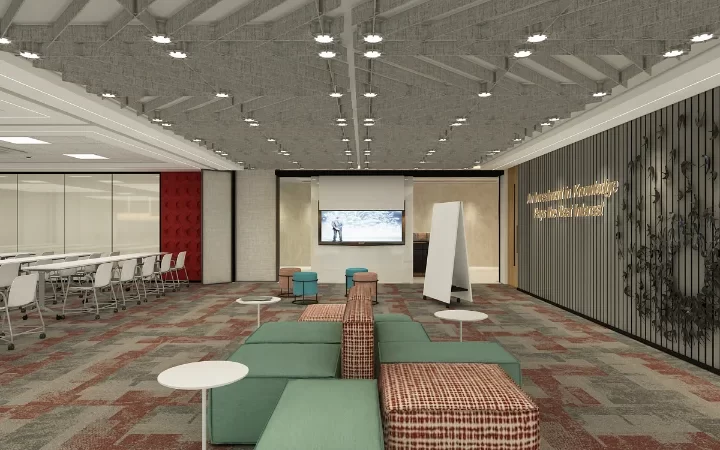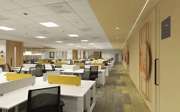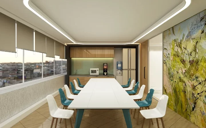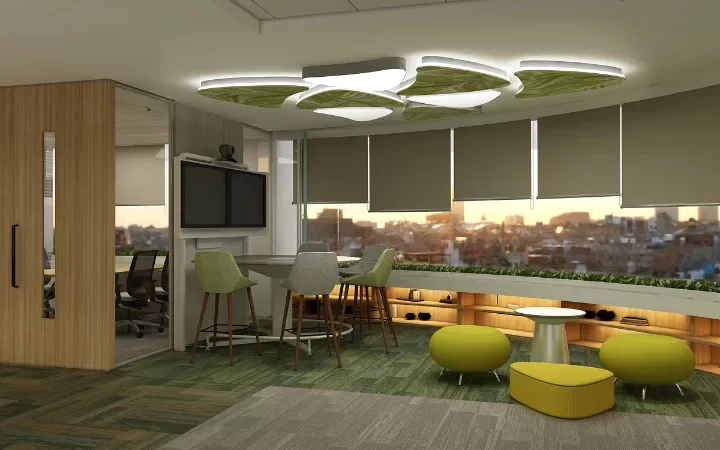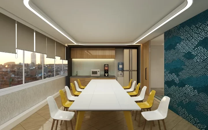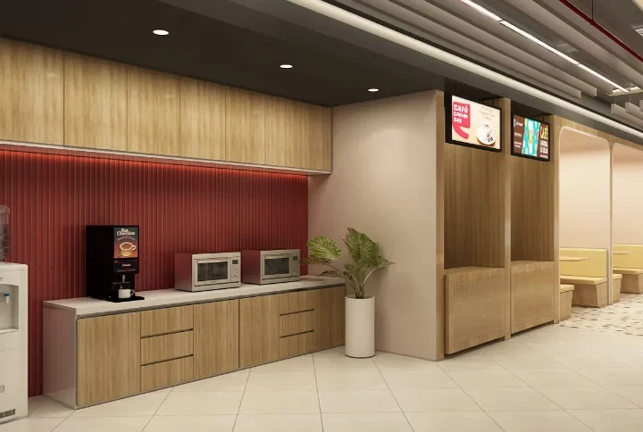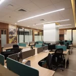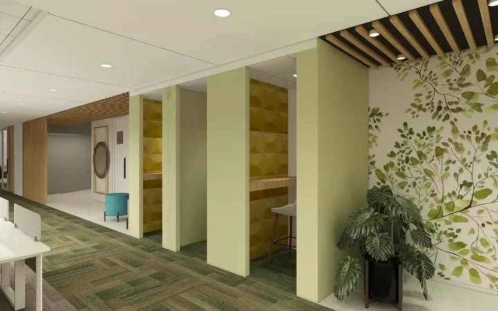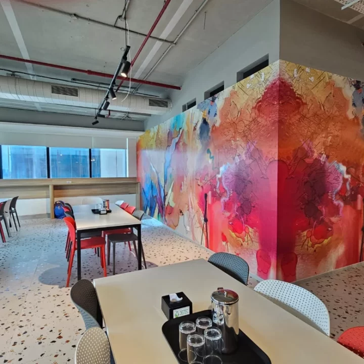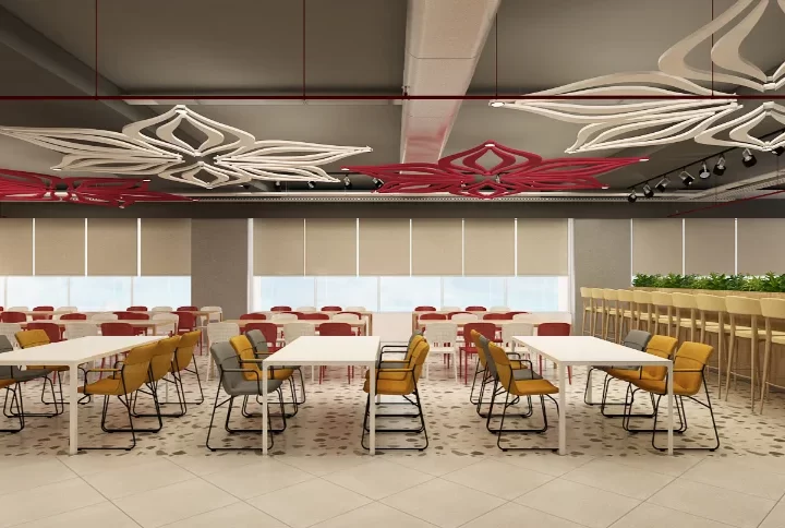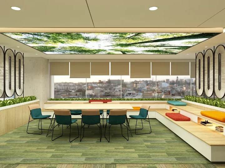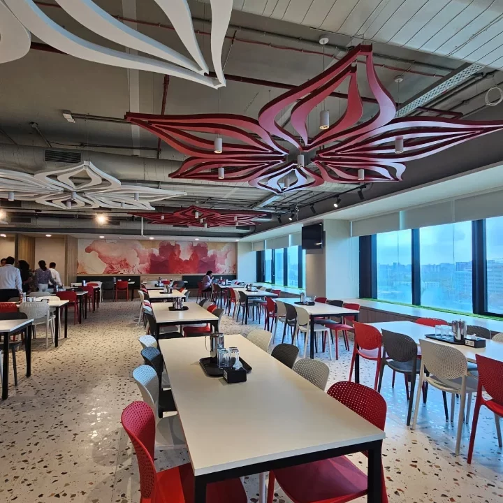 The open office demanded a break in its continuous clusters of workstations, which were achieved with intermediate breakout zones and vertical rafters on the background of colors and graphics. Coffee nooks and Pantries with arrangements to double up as a brainstorming area, added up as breakouts to the densely planned floorplate. The cafeteria is where we are ourselves, hence, the design was rested on the vibrant colors of autumn with huge installations of floral murals, making it a lively space. The high-low seating and benches made the user feel comfortable as per their needs of relaxing for a break.