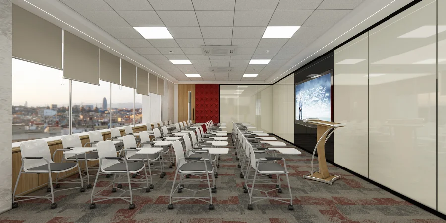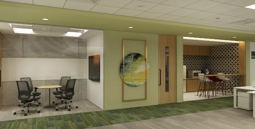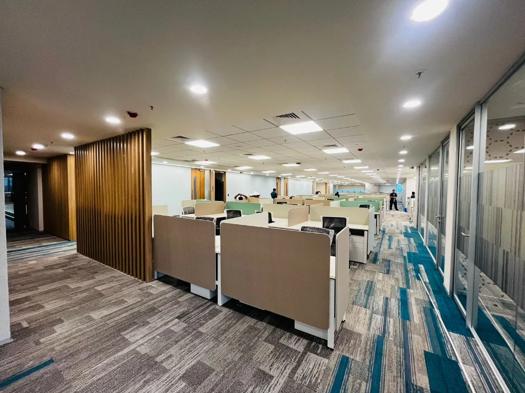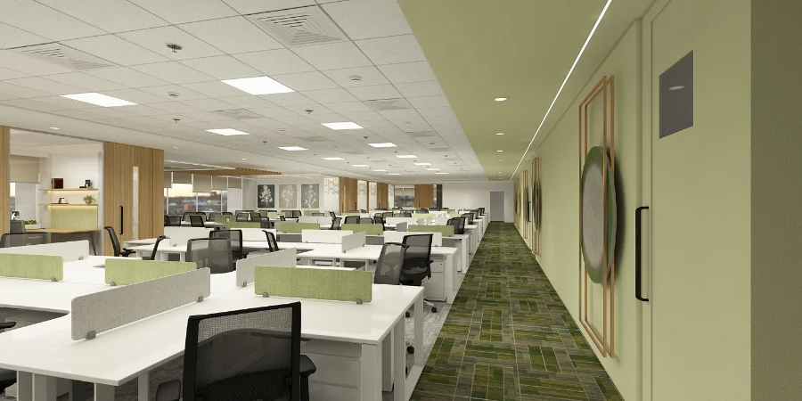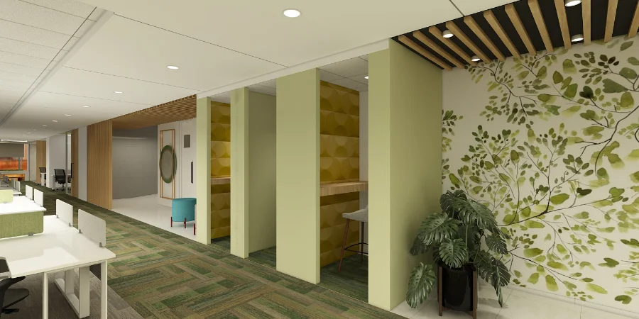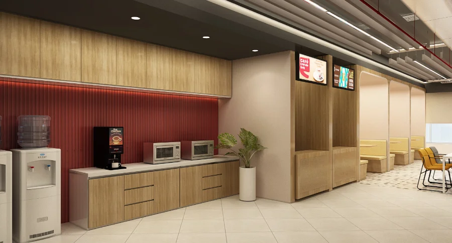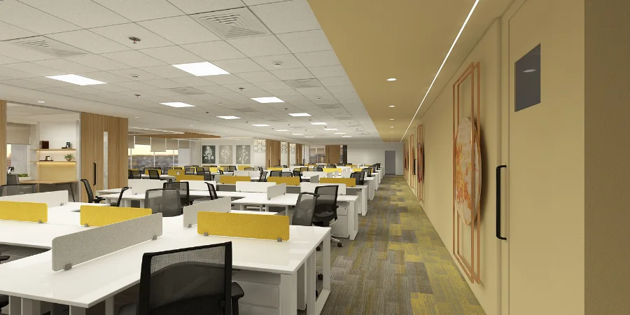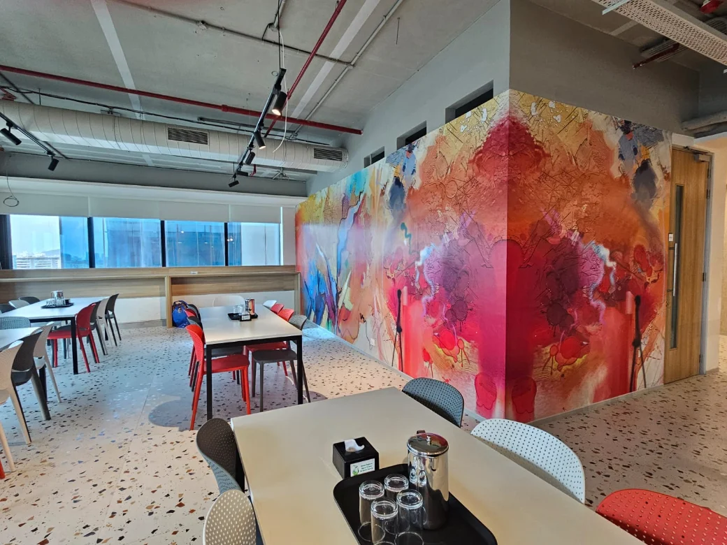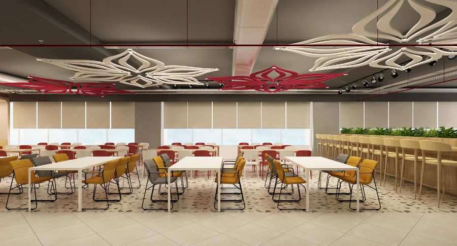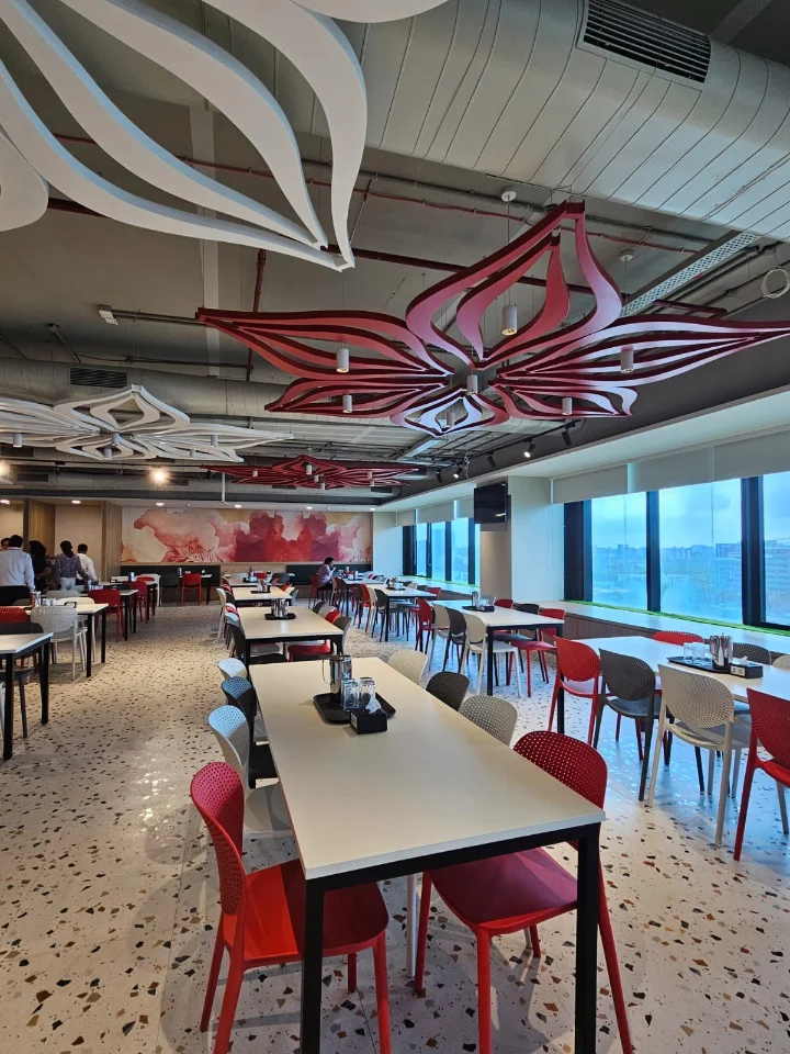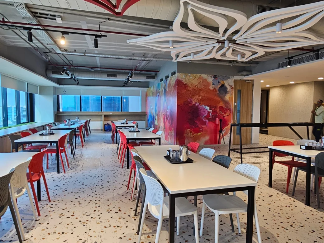 The open office demanded a break in its continuous clusters of workstations, which were achieved with intermediate breakout zones and vertical rafters on the background of colors and graphics. Coffee nooks and Pantries with arrangements to double up as a brainstorming area, added up as breakouts to the densely planned floorplate. The cafeteria is where we are ourselves, hence, the design was rested on the vibrant colors of autumn with huge installations of floral murals, making it a lively space. The high-low seating and benches made the user feel comfortable as per their needs of relaxing for a break.