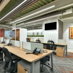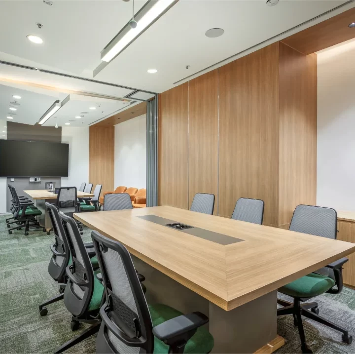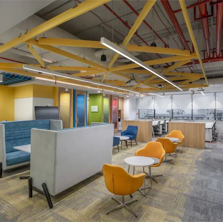 The design was governed by an amalgamation of open workstation area and a core collaboration zone, that doubled-up as a townhall for office events. The technology to build such flexible spaces were well designed with consultants who integrated our theme seamlessly in their proposals. Acoustics in an open office space is just as important as the aesthetics and the services. Considering the concept was governed by an open ceiling, we designed baffles in the ceiling with creative forms and colors to enhance the sound absorption. The sound transfer was restricted using a double-glazed partition and acoustics elements inside the enclosures.