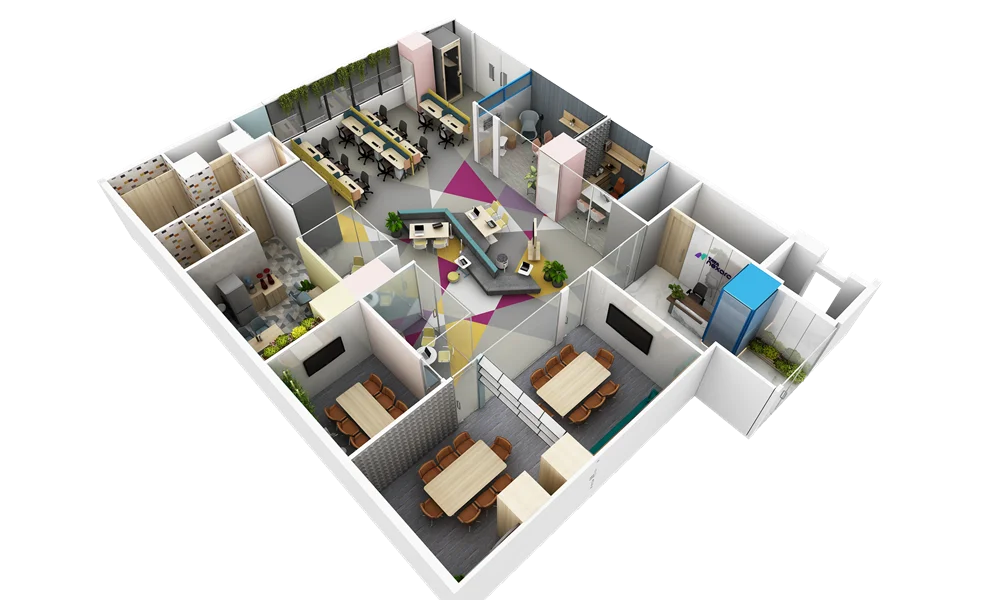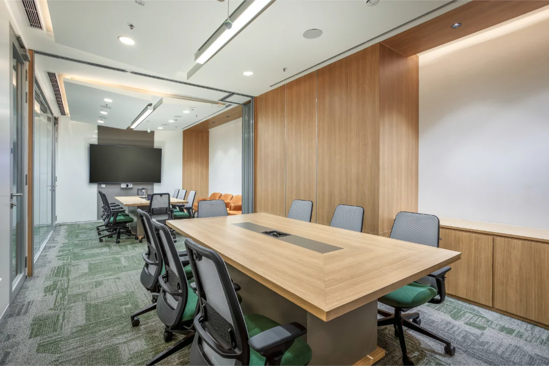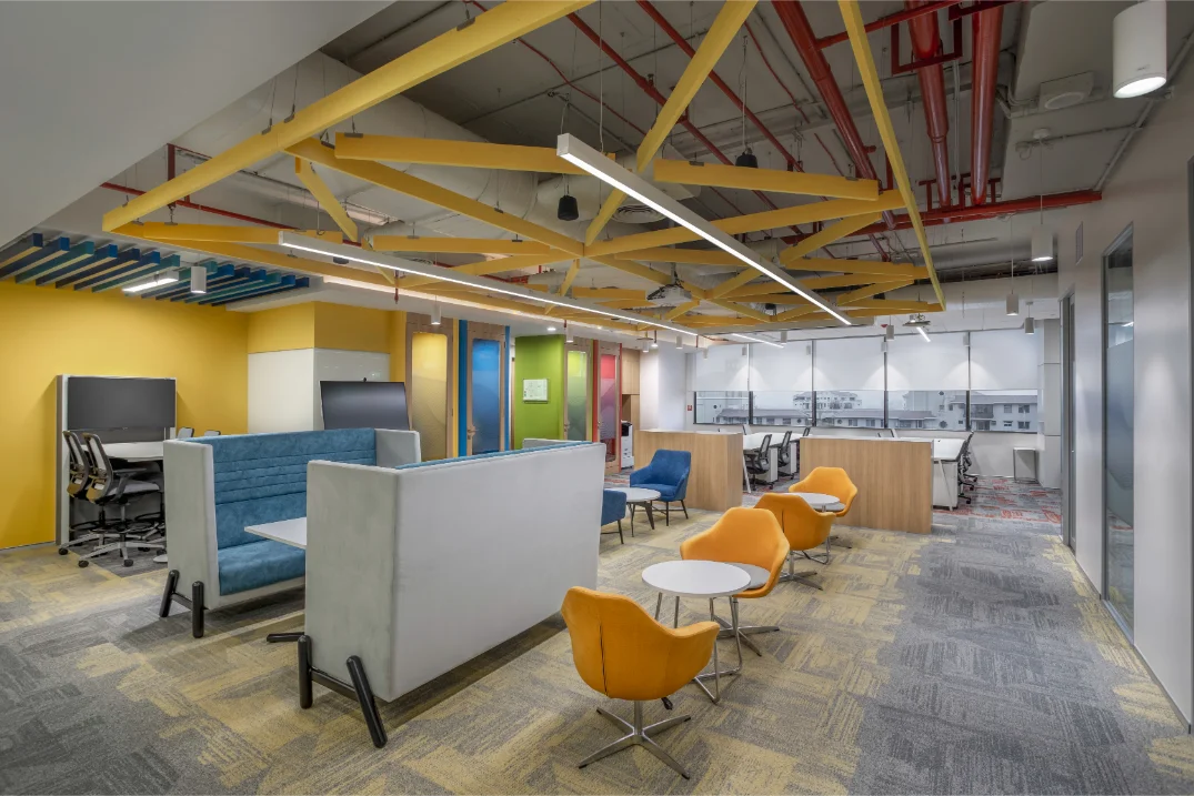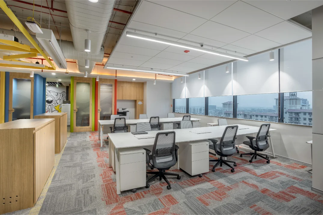 The design was governed by an amalgamation of open workstation area and a core collaboration zone, that doubled-up as a townhall for office events. The technology to build such flexible spaces were well designed with consultants who integrated our theme seamlessly in their proposals. Acoustics in an open office space is just as important as the aesthetics and the services. Considering the concept was governed by an open ceiling, we designed baffles in the ceiling with creative forms and colors to enhance the sound absorption. The sound transfer was restricted using a double-glazed partition and acoustics elements inside the enclosures.