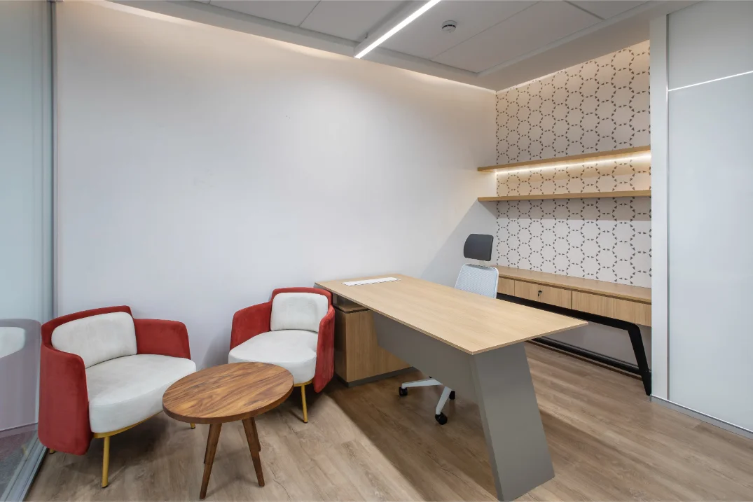 The office was designed and built to cater to the young minds working towards creating a value for emerging business by discovering new growth opportunities for MSMEs. Being an emerging organization ourselves, we could understand the client brief and the need to create a space with belongingness and a teamwork environment. The space had to cater to an open office design with flexible meeting spaces – both formal and casual. Management enclosures and enclosed phone booths were planned towards the solid walled periphery giving the desirable natural light to the workspaces and the collaborative core.