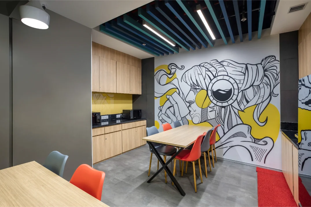 The hues in the office were of utmost importance as the place needed to reflect young talents at work. We complimented the strong primary colors that met the eye through paints and writing surfaces, to a subtle pastel complimentary color in the carpets. The reds, blues, yellows and greens set up the right ambience for graffiti wallpapers that were sprinkled across the office elevation. Keeping a controlled color splash, the furniture was in similar tones with different textures. The collaboration gears were designed to cater small meets, large group discussions and focused working.