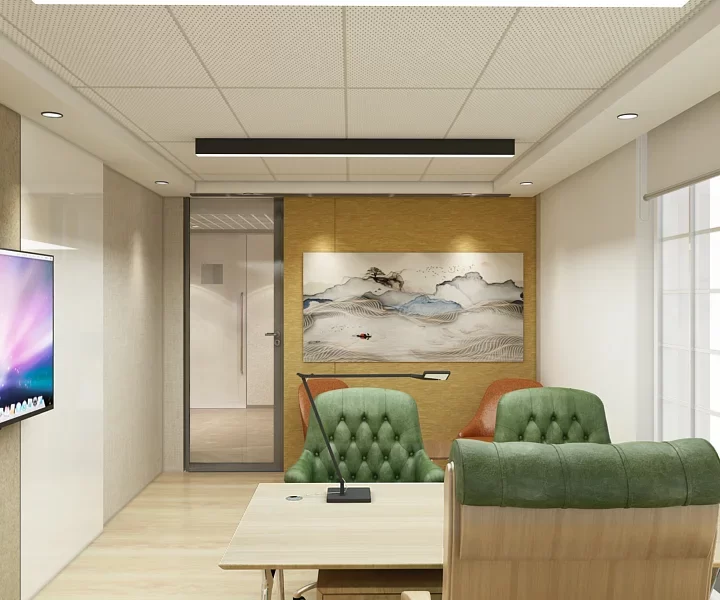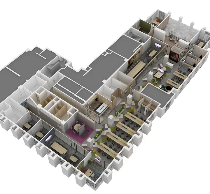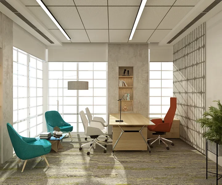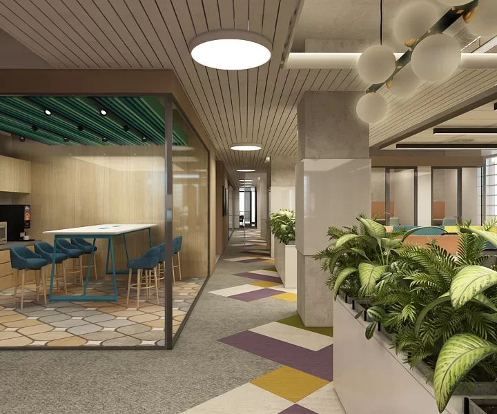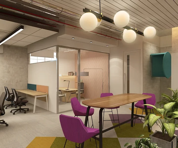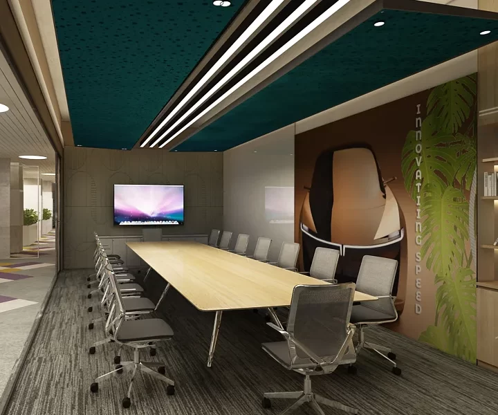 The space was on an upper mezzanine which housed the building services making the usage of the height and shafts limited. The height posed a challenge to integrate the two very different work patterns as the ceiling acoustic played a very important role. We connected the space through a design of various elements such as winged ceilings in meeting rooms, acoustic baffles in Collab’s and suspended grid ceiling in workstation areas, creating a pattern that connected the space and concealed the services. The carpet patterns, further added to the connection of the spaces.