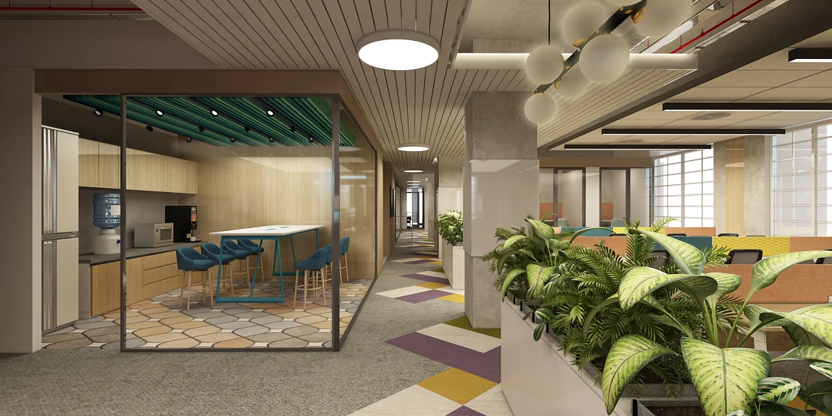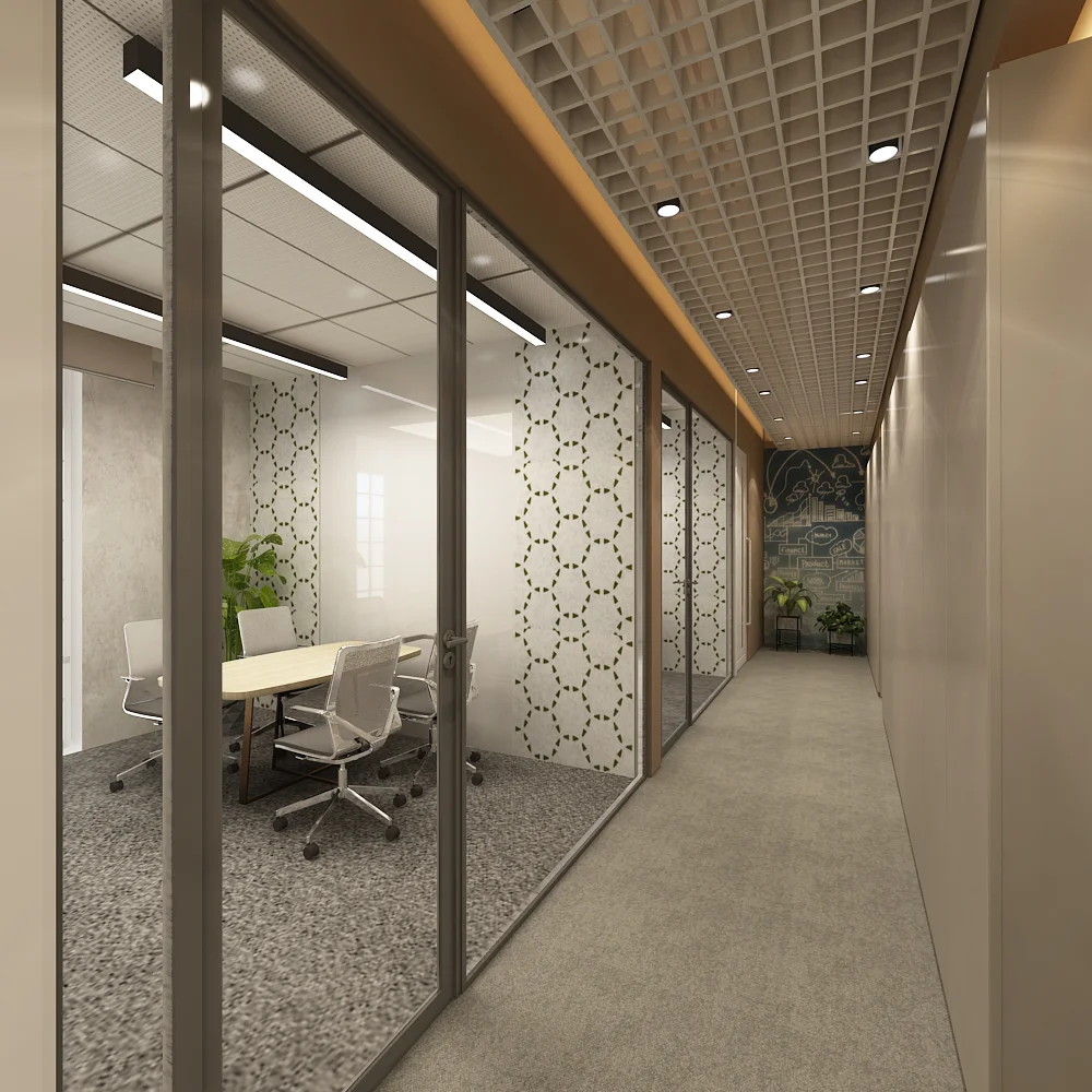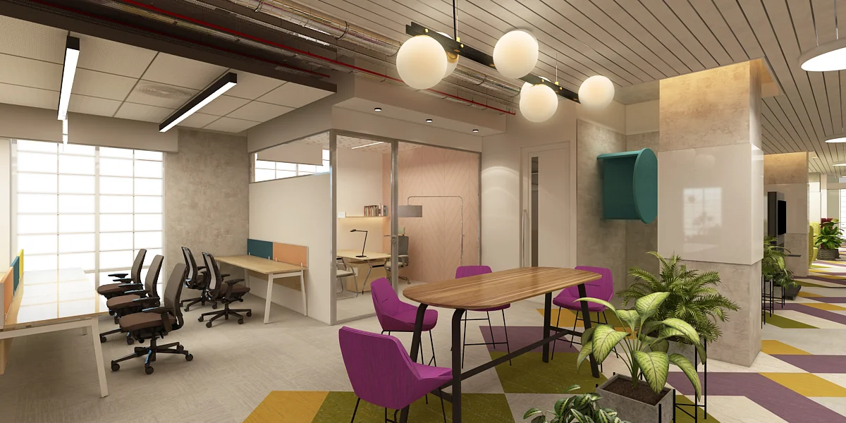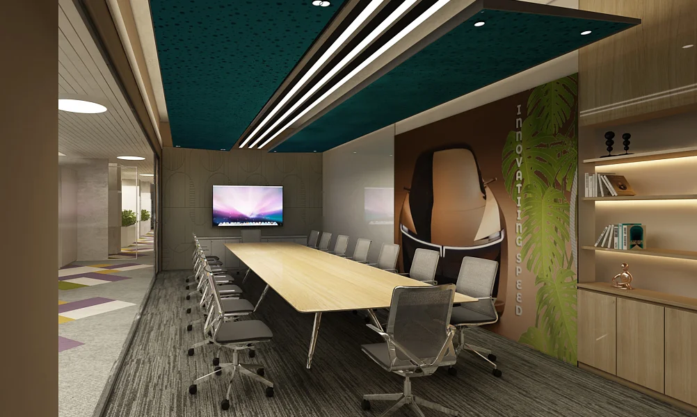 The space was on an upper mezzanine which housed the building services making the usage of the height and shafts limited. The height posed a challenge to integrate the two very different work patterns as the ceiling acoustic played a very important role. We connected the space through a design of various elements such as winged ceilings in meeting rooms, acoustic baffles in Collab’s and suspended grid ceiling in workstation areas, creating a pattern that connected the space and concealed the services. The carpet patterns, further added to the connection of the spaces.