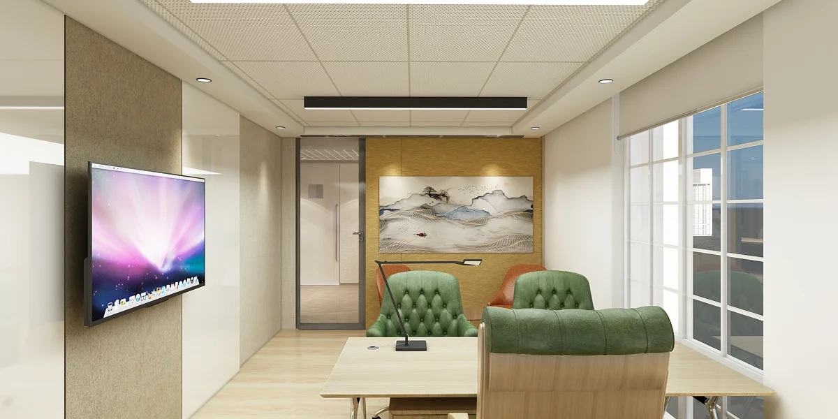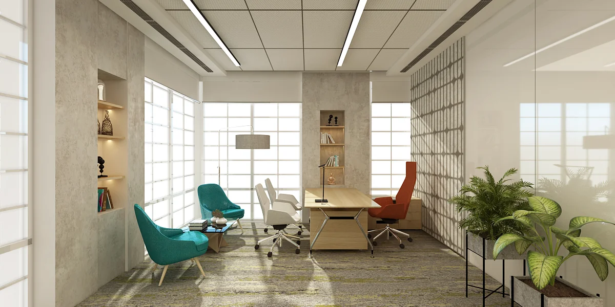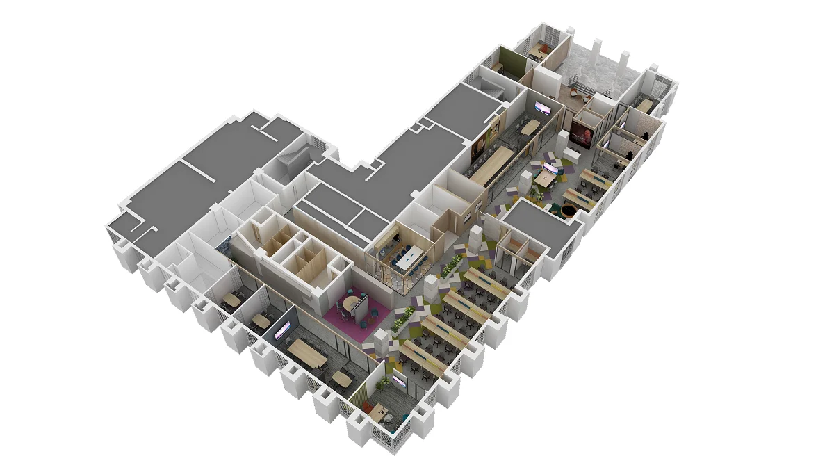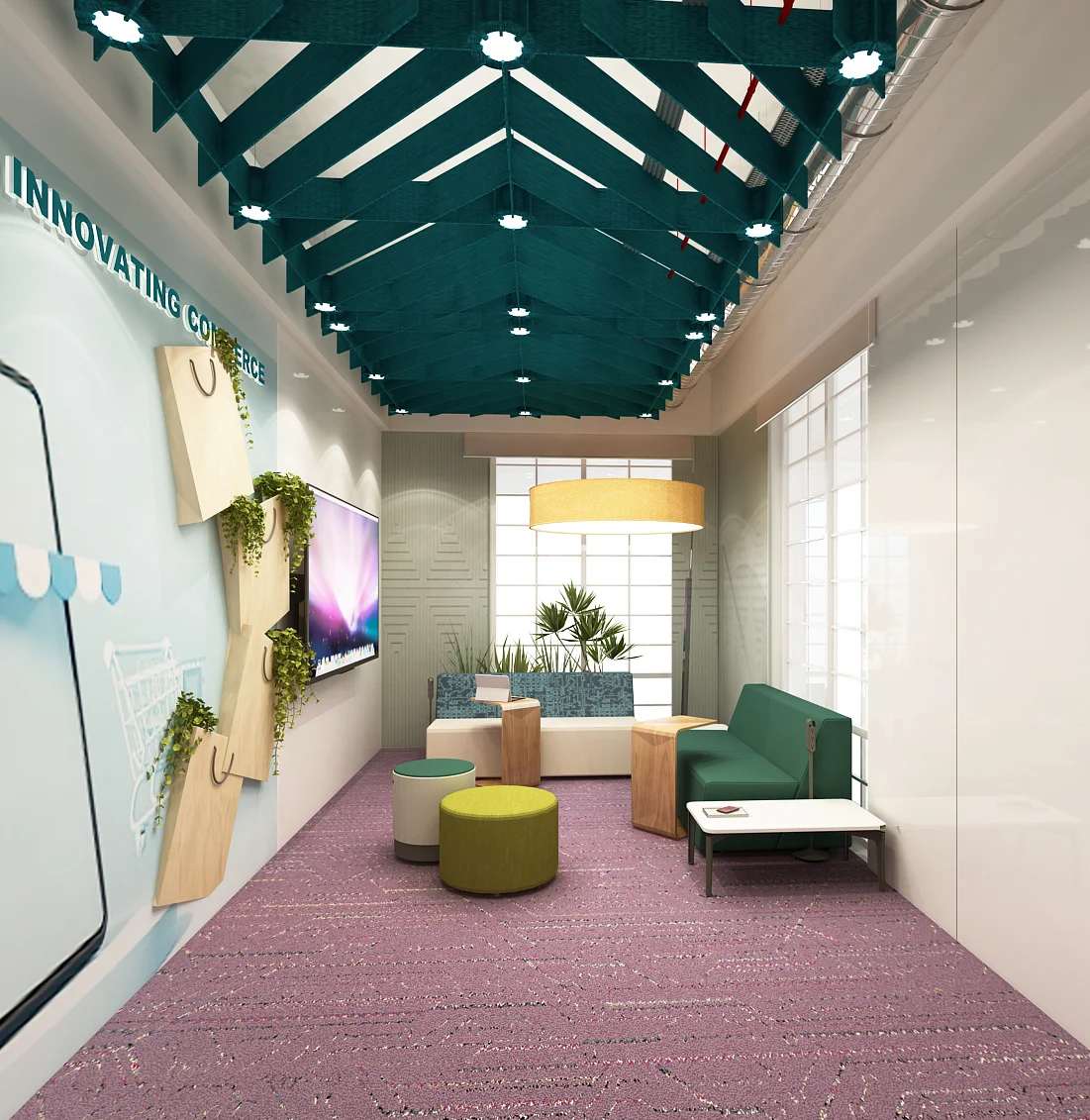 The space was on an upper mezzanine which housed the building services making the usage of the height and shafts limited. The height posed a challenge to integrate the two very different work patterns as the ceiling acoustic played a very important role. We connected the space through a design of various elements such as winged ceilings in meeting rooms, acoustic baffles in Collab’s and suspended grid ceiling in workstation areas, creating a pattern that connected the space and concealed the services. The carpet patterns, further added to the connection of the spaces.